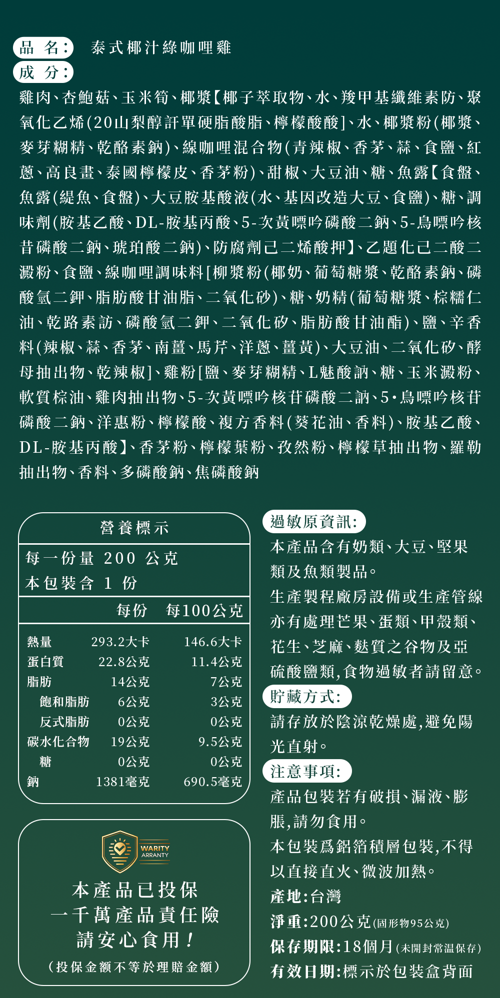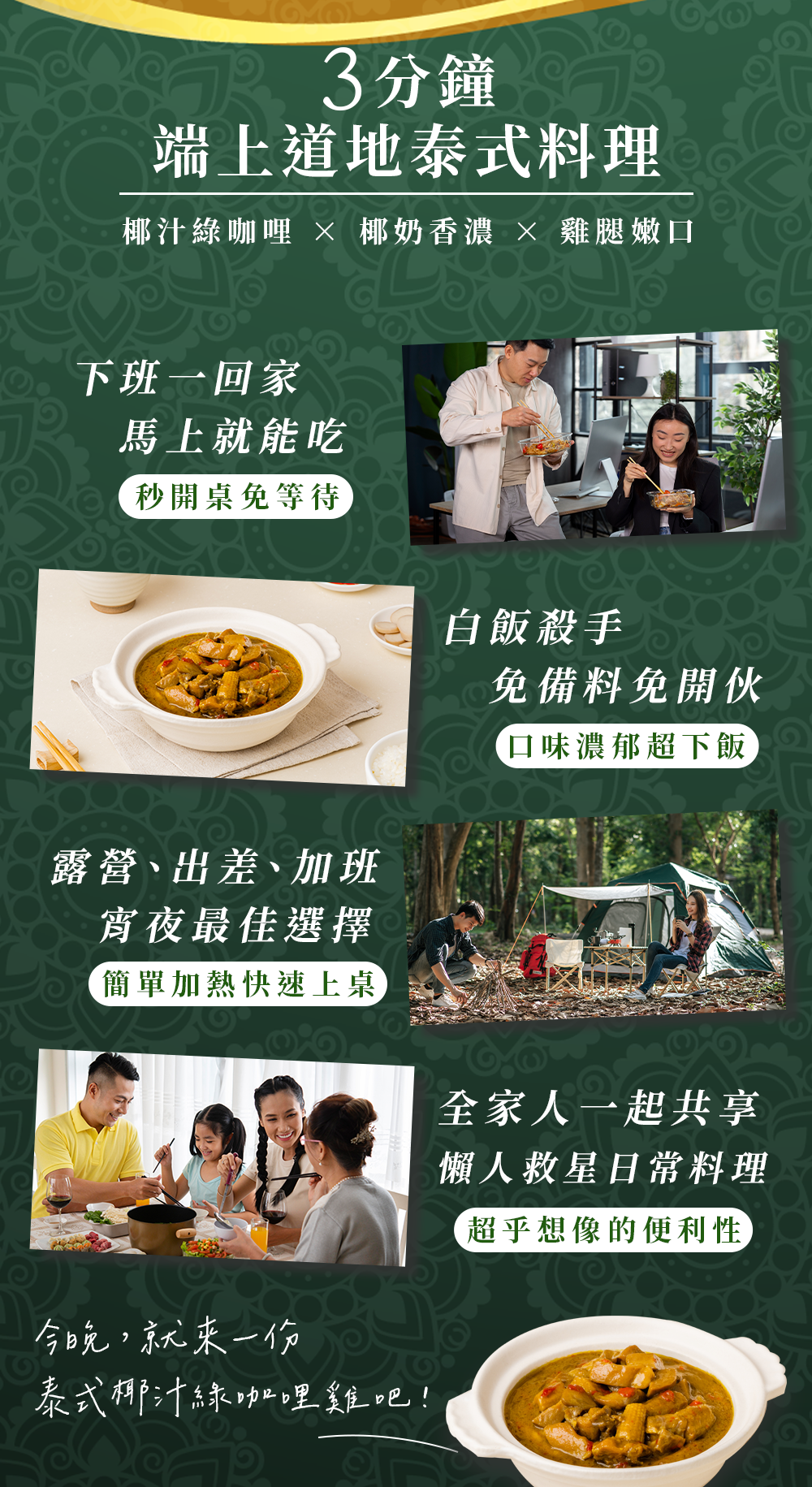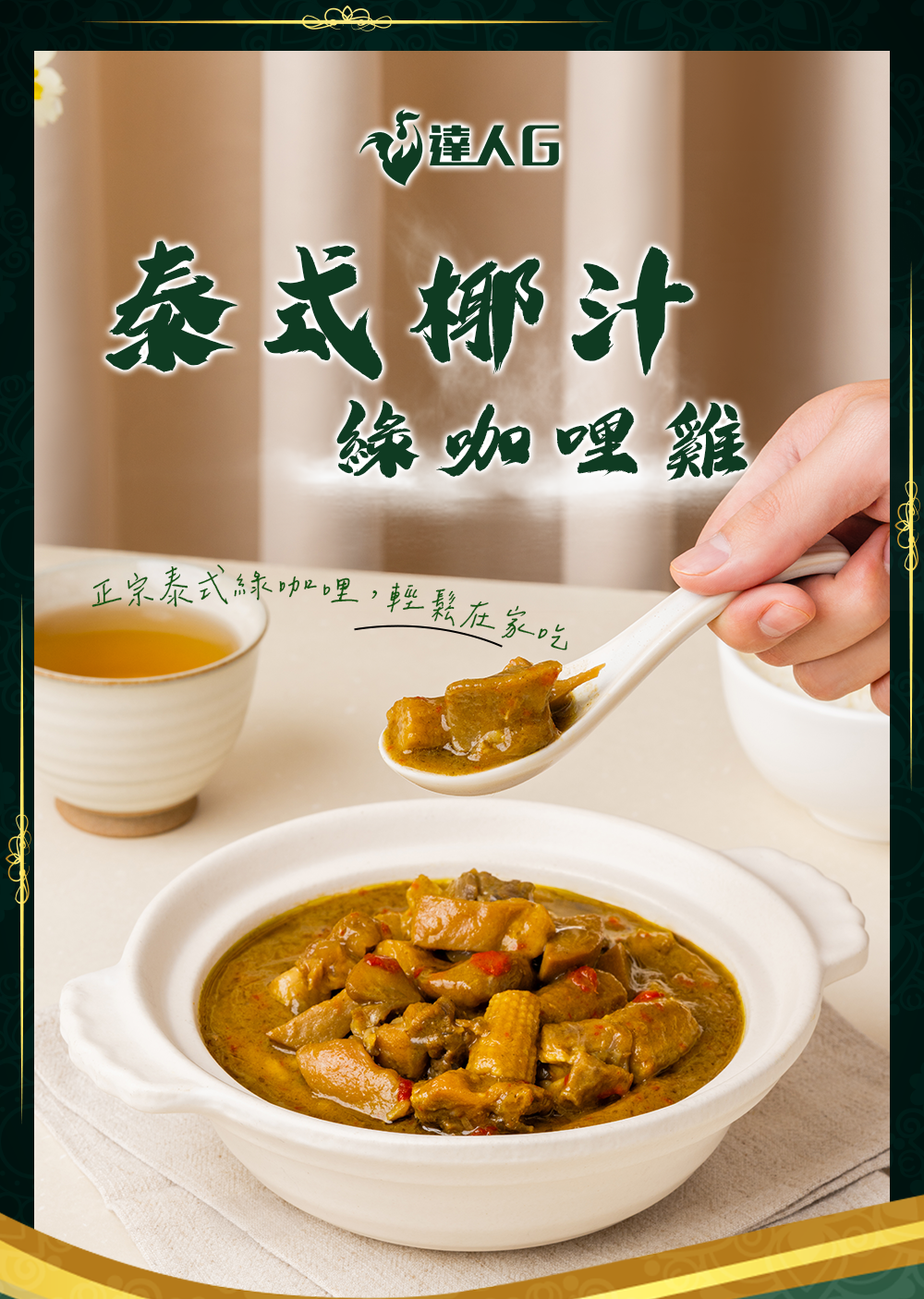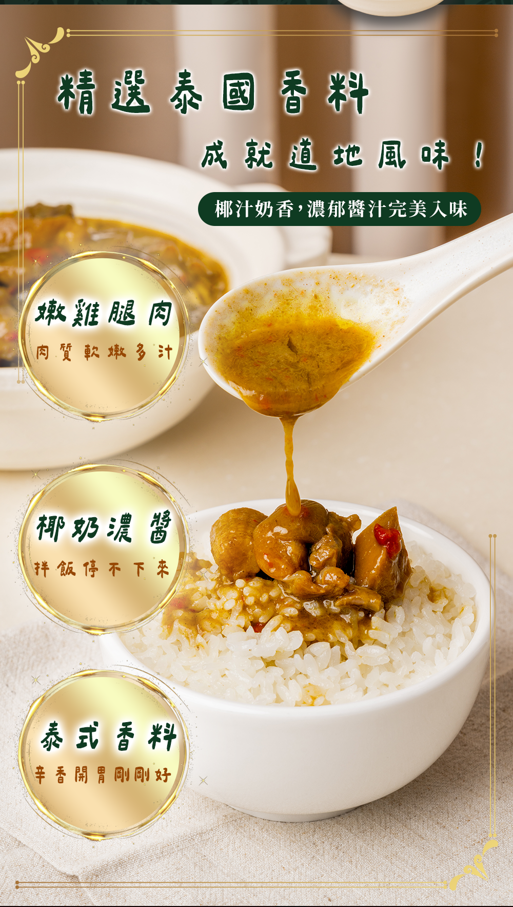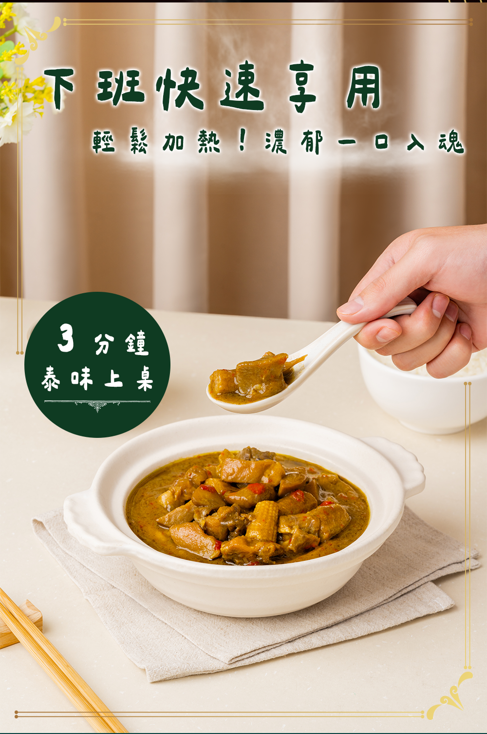 嚴選鮮嫩雞腿肉,搭配濃郁泰式綠咖哩醬,香醇微辣超下飯!